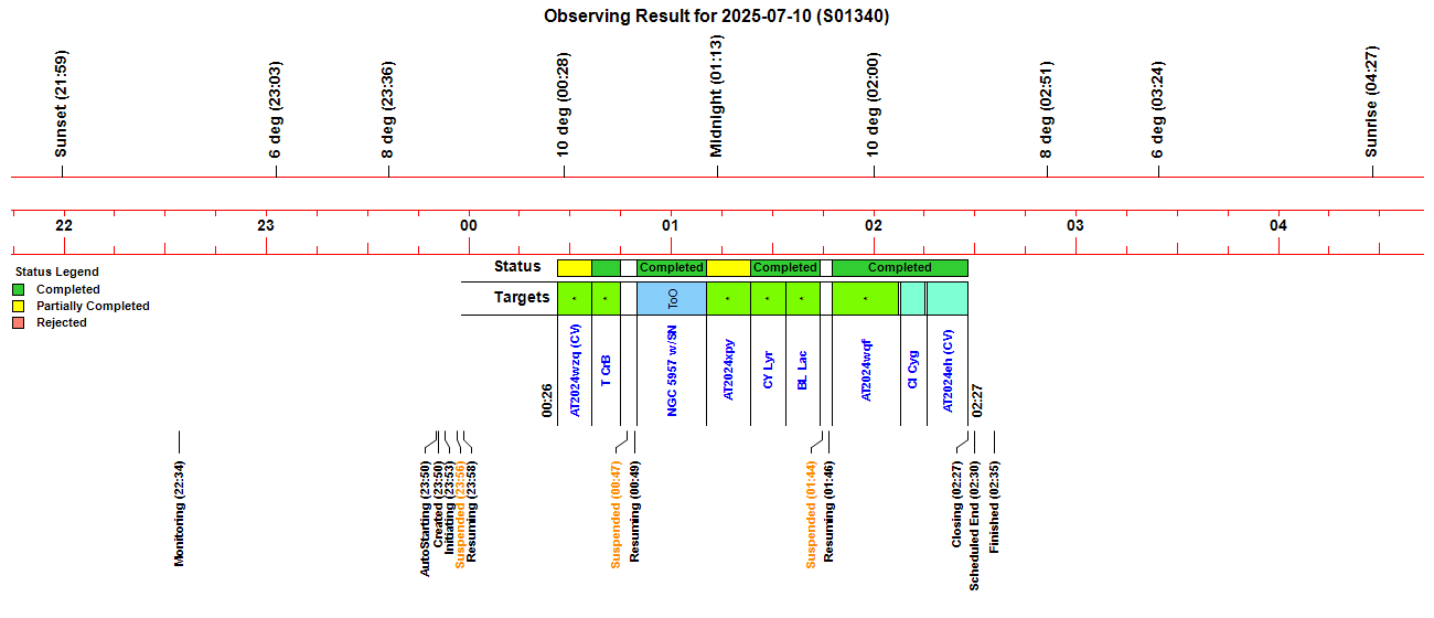 AT 2024eh - CV Type Transient AT 2024wqf - Type AGN Transient (4C 27.50) AT 2024wzq - CV Type Transient AT 2024xpy - Type BL Transient NGC 5957 - Spiral Galaxy with Type Ia Supernova 2025fvw Variable Stars (photometric monitoring) - T CrB, CI Cyg, BL Lac, CY Lyr Nearby Stars (astrometric monitoring) - None