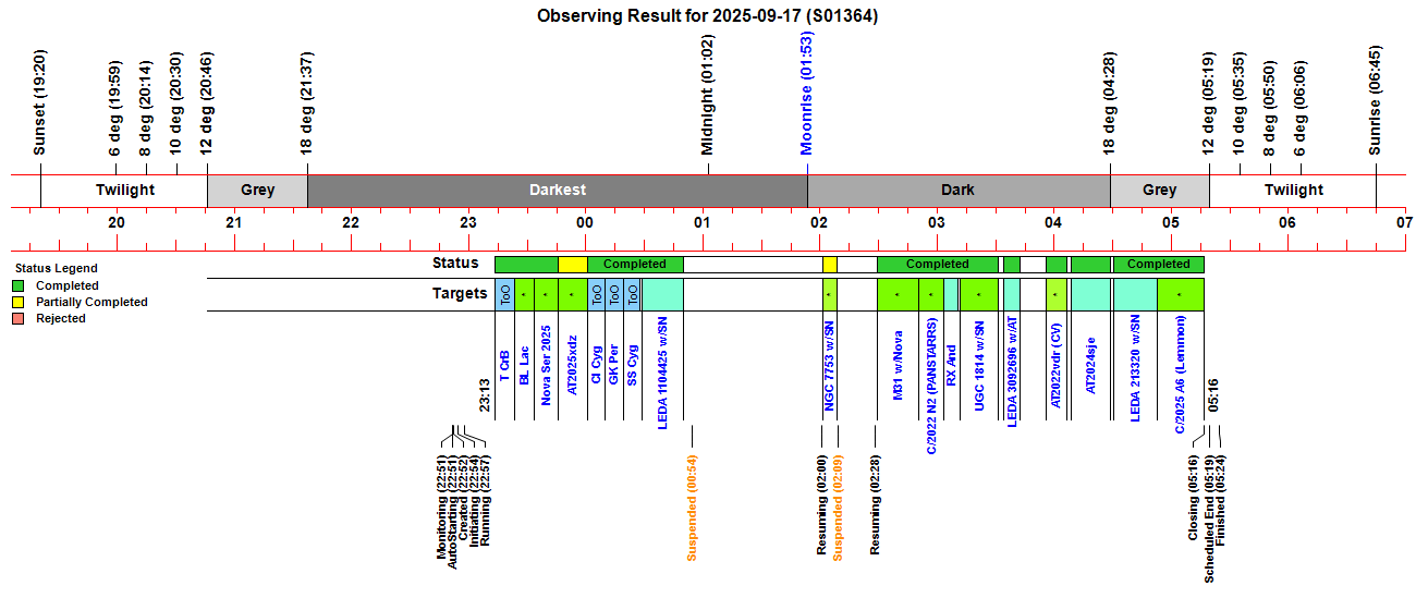 C/2022 N2 (PANSTARRS) - Comet C/2025 A6 (Lemmon) - Comet Nova Ser 2025 (V691 Ser) AT 2022vdr - CV Type Transient AT 2024sje - Type YSO Transient (near B33) AT 2025xdz - Type CV? Transient (non-detection) LEDA 213320 - Galaxy with Type Ia Supernova 2025tji M31 - Spiral Galaxy with EGN Type Transient AT 2025wwe PGC 17707 - Spiral Galaxy UGC 1814 - Spiral Galaxy with Type II Supernova 2025oas - LEDA 1104425 w/SN2025nou and NGC 7753 w/SN 2025kyg attempts failed (due to cloud), LEDA 3092696 w/AT2025nzh attempt failed (due to unexplained glitch is exposure/filter selection) Variable Stars (photometric monitoring) - RX And, T CrB, CI Cyg, SS Cyg, BL Lac, GK Per Nearby Stars (astrometric monitoring) - None