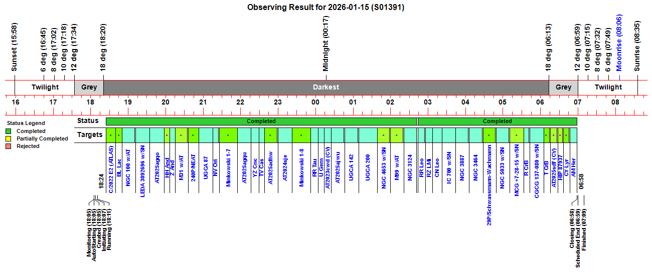 Image below (2026-01-16.144) was taken 22.9 days after discovery of 2025aico Position of reported supernova (distinct) is shown by white cross-hairs Measured Magnitude +15.13 (Clear Filter) |