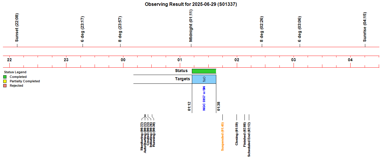 | 00:36:50 | CCDSoft Restarting | CCDSoft being restarted (attempt to fix frozen CcdCamera) | |